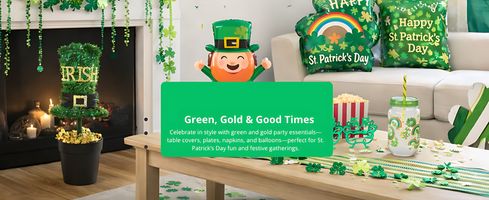 Celebrate in style with green and gold party essentials—table covers, plates, napkins, and balloons—perfect for St. Patrick’s Day fun and festive gatherings. ☘️
